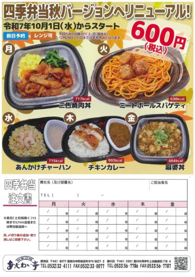 お知らせNEWS 2025/09/10 四季弁当グランプリ(秋) 秋バージョンの四季弁当グランプリへ沢山のご応募をいただき 誠にありがとうございました。 採用された中からグランプリに選ばれたお客様に感謝を伝えて まいりました。ありがとうございました! 中神様の考えていただいたメニューも10月からのスタートします。 皆さん楽しみにしてください。 全て ピックアップ